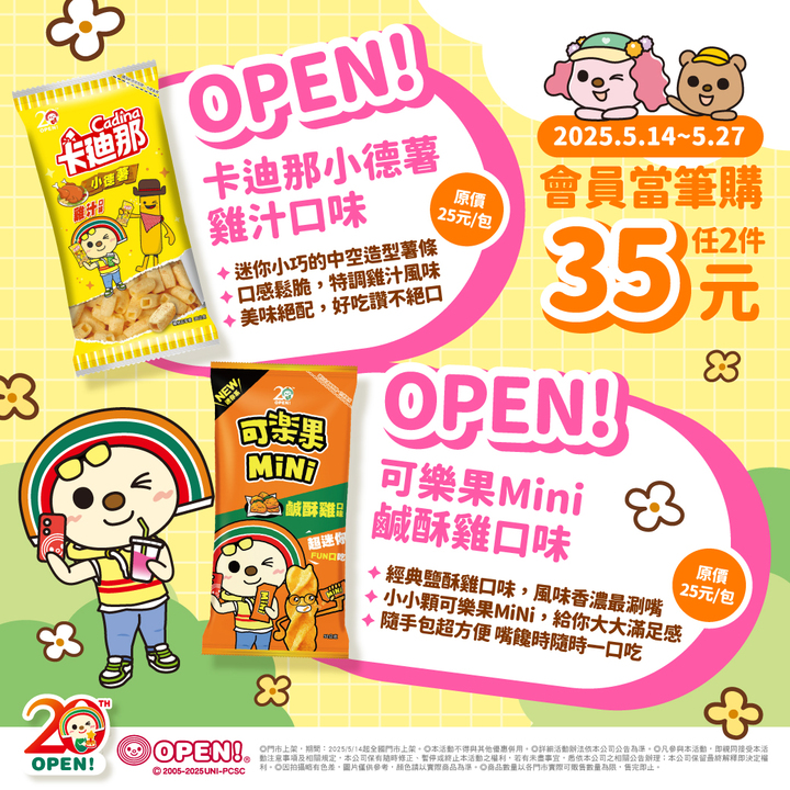 可樂果OPEN! Mini鹹酥雞口味 商品說明 小小顆可樂果MiNi 給你大大滿足感 隨手包超方便 嘴饞時隨時吃 超涮嘴的鹹酥雞口味 讓你一口接一口 OPEN!家族限定包裝 5/14~5/27 當筆加價購 任兩件35元 (原價 25元/包) 售價 25元/包 回商品列表頁 ◎門市上架,期間: 2025/5/14起全國門市上架 ◎因拍攝略有色差,圖片僅供參考,顏色請以實際商品為準。 ◎本活動不得與其他優惠併用。 ◎詳細活動辦法一本公司公告為主準。 ◎凡參與本活動,即視同接受本活動注意事項及相關規定,本公司保有隨時修正、暫停或終止本活動之權利,若有未盡事宜,悉依本公司之相關公告辦理;本公司保留最終解釋即決定權力。