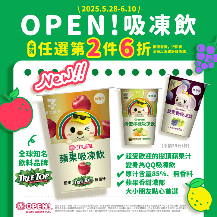 OPEN!蘋果吸凍飲 商品說明 全球知名飲料品牌Tree Top 超受歡迎的樹頂蘋果汁變身為QQ吸凍飲 原汁含量85%、無香料 蘋果的香甜濃郁 吸凍飲的QQ口感 大朋友、小朋友點心首選 5/28~6/10 OPEN!吸凍飲系列口味任選第二件6折 (原價 39元/杯) 售價 39元/杯 回商品列表頁 ◎門市上架,期間: 2025/5/28起全國門市上架 ◎因拍攝略有色差,圖片僅供參考,顏色請以實際商品為準。 ◎本活動不得與其他優惠併用。 ◎詳細活動辦法一本公司公告為主準。 ◎凡參與本活動,即視同接受本活動注意事項及相關規定,本公司保有隨時修正、暫停或終止本活動之權利,若有未盡事宜,悉依本公司之相關公告辦理;本公司保留最終解釋即決定權力。