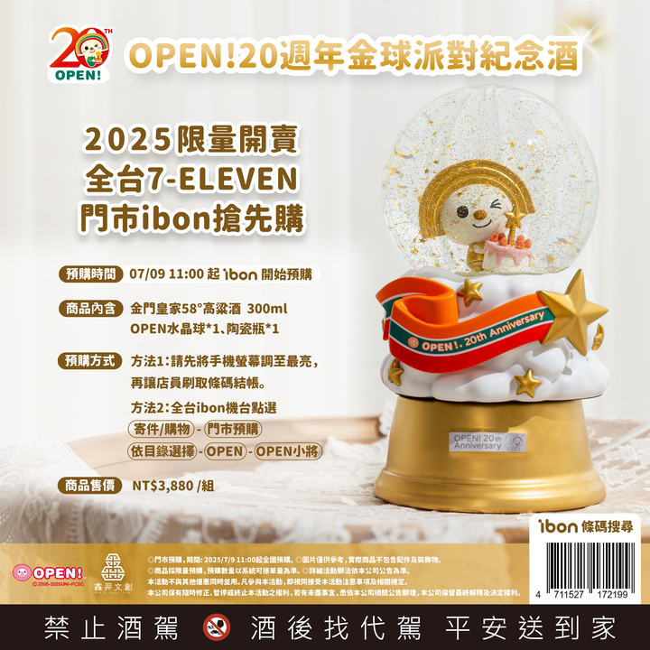預購 OPEN!20週年金球派對紀念酒 商品說明 水晶球造型設計,夢幻收藏必備 OPEN將手捧生日蛋糕,超萌立體造型 搖晃會有金粉與星星亮片飛舞 金門皇家 58 度高粱酒入酒 金色電鍍瓶身,組數有限,快來收藏! 預購方式: 1️⃣將手機螢幕調至最亮,再讓店員刷取條碼結帳 2️⃣全台ibon機台-門市預購-OPEN-OPEN小將(亦可依條碼26581477搜尋) 售價 3880元/組 回商品列表頁 ◎門市預購,期間: 2025/7/9 11:00起全國預購。 ◎圖片僅供參考,實際商品不包含配件及裝飾物。 ◎商品採預購,預購數量以系統可接單量為準。 ◎詳細活動辦法依本公司公告為準。本活動不與其他優惠同時並用。凡參與本活動,即視同接受本活動注意事項及相關規定。本公司保有隨時修正、暫停或終止本活動之權利,若有未盡事宜,悉依本公司相關公告辦理,本公司保留最終解釋及決定權利。 ◎本商品不得使用本公司所發行之商品卡、禮券、隨取卡和雲端開心卡進行購買,且不參與全店集點活動。