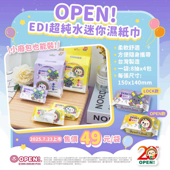OPEN!EDI超純水迷你濕紙巾 商品說明 柔軟舒適,採用EDI超純水 出門必備!迷你尺寸小廢包也能裝 OPEN款、LOCK兩款設計超可愛 台灣製造安心使用 一袋:8抽x4包 每張尺寸150x140mm 售價 49元/袋 回商品列表頁 ◎因拍攝略有色差,圖片僅供參考,顏色請以實際商品為準。 ◎本活動不得與其他優惠併用。 ◎詳細活動辦法一本公司公告為主準。 ◎凡參與本活動,即視同接受本活動注意事項及相關規定,本公司保有隨時修正、暫停或終止本活動之權利,若有未盡事宜,悉依本公司之相關公告辦理;本公司保留最終解釋即決定權力。