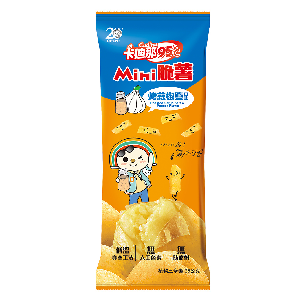 NEW! OPEN!卡迪那95度C mini脆薯-烤蒜椒鹽 商品說明 1.100%馬鈴薯鮮切,低溫真空工法製成 2.脆薯薯香濃郁,搭配烤蒜椒鹽口味 3.鹹香濃郁、蒜味十足,好吃不喊卡! 4.OPEN!家族限定包裝 售價 25元/件 回商品列表頁 ◎門市上架,期間: 2025/10/15 起指定門市上架 ◎因拍攝略有色差,圖片僅供參考,顏色請以實際商品為準。 ◎本活動不得與其他優惠併用。 ◎詳細活動辦法一本公司公告為主準。 ◎凡參與本活動,即視同接受本活動注意事項及相關規定,本公司保有隨時修正、暫停或終止本活動之權利,若有未盡事宜,悉依本公司之相關公告辦理;本公司保留最終解釋即決定權力。